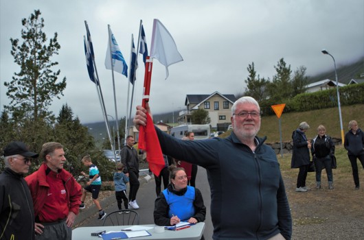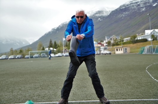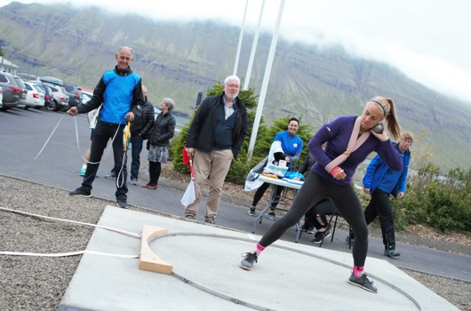 Íþróttahetjan Hreinn Halldórsson er einn af dómurunum á Landsmóti UMFÍ 50+ sem fram fer í Neskaupstað um helgina. Á föstudag dæmdi hann í kúluvarpi en fleiri kastgreinum á laugardag. Frjálsar íþróttir eru með vinsælustu greinunum á mótinu og keppendur margir.