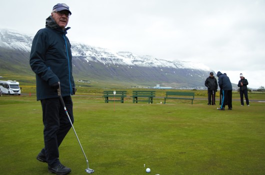„Grái fjallahringurinn myndar afskaplega fallega umgjörð. Þetta er góður dagur svo lengi sem hann blæs ekki,“ segir íþróttakennarinn Flemming Jessen þar sem hann stendur á Grænanesvelli, golfvellinum í Neskaupstað á meðal fjölda þátttakenda í pútti á Landsmóti UMFÍ 50+ í Neskaupstað.