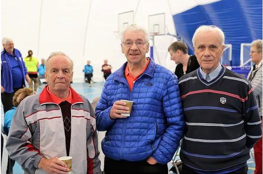 „Það er gaman að hittast eftir þetta langan tíma,“ segja þeir Einar, Sveinn og Gunnlaugur frá Siglufirði, sem fylgdust með konum sínum keppa í boccía á Landsmóti UMFÍ 50+ sem hófst í Hveragerði í morgun. Mótið stendur fram á sunnudag. Þremenningarnir hafa ekki hist í 40 ár eða síðan árið 1977.