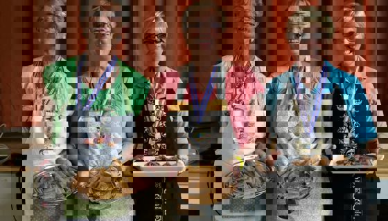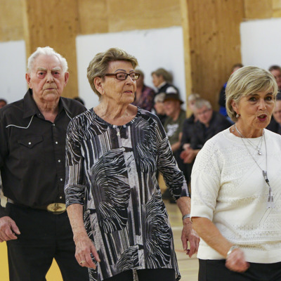 Á myndunum hér að neðan má sjá Eygló í pönnukökubakstri á Landsmóti UMFÍ 50+ á Ísafirði árið 2016 og með línudanshópnum spræka við setningu mótsins í Vogum í kvöld.