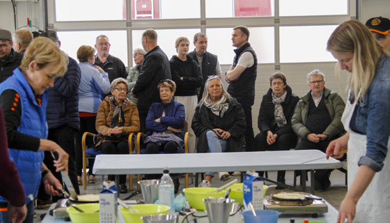 Áhorfendur gengu á lyktina í keppni í pönnukökubakstri á Landsmóti UMFÍ 50+ sem fram fer í Vogum á Vatnsleysuströnd um helgina. Í keppninni var dæmt eftir hraða, fjölda pönnukaka, leikni, útliti, bragðgæðum og fleiri þáttum.
