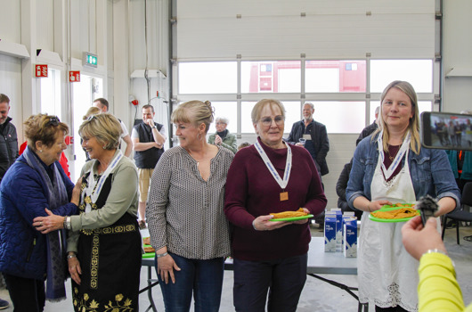 Áhorfendur gengu á lyktina í keppni í pönnukökubakstri á Landsmóti UMFÍ 50+ sem fram fer í Vogum á Vatnsleysuströnd um helgina. Áhorfendur fengu að smakka á pönnukökunum að keppni lokinni.