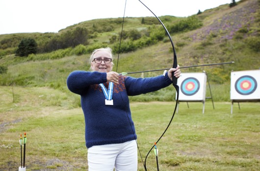Ásthildur Einarsdóttir jurtalæknir tók sig vel út með bogann í keppni í bogfimi í gær. Þetta var í fyrsta sinn sem hún mundaði boga. Það skiptir öllu máli að vera með því hún lenti í 2. sæti í kvennaflokki. Úrslit úr ýmsum greinum er að finna á úrslitasíðu Landsmótsins.