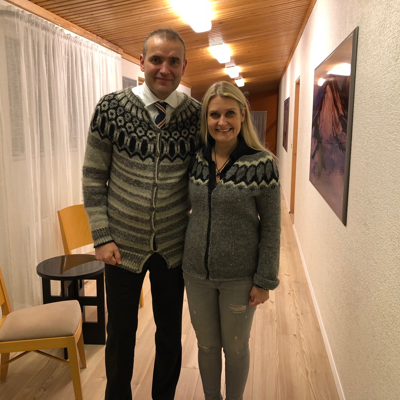 Á myndinni hér að ofan má sjá forseta Íslands ásamt Önnu Margréti, hvort í sinni lopapeysunni.