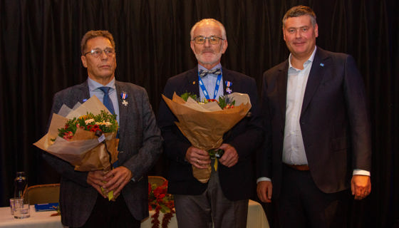 Þeir Guðmundur Kr. Jónsson og Haukur Valtýsson voru gerður að heiðursfélögum UMFÍ á Sambandsþingi UMFÍ í gærkvöldi. Heiðursfélagakross sem þeir fengu af tilefninu er æðsta heiðursmerki samtakanna. Haukur er fyrrverandi formaður UMFÍ og Guðmundur Kr. hefur lengi verið framarlega í forystu Héraðssambandsins Skarphéðins (HSK) og Ungmennafélags Selfoss. Báðir hafa þeir verið sæmdir nær öllum þeim heiðursviðurkenningum fyrir störfin sem hægt er að fá innan íþróttahreyfingarinnar.