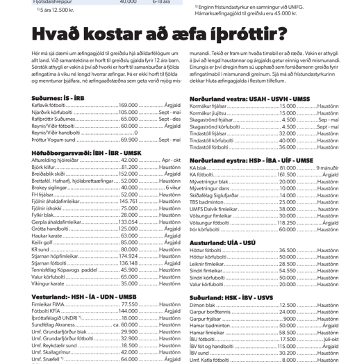 Í blaðinu er jafnframt því velt upp hvað kostar að æfa íþróttir á nokkrum stöðum.