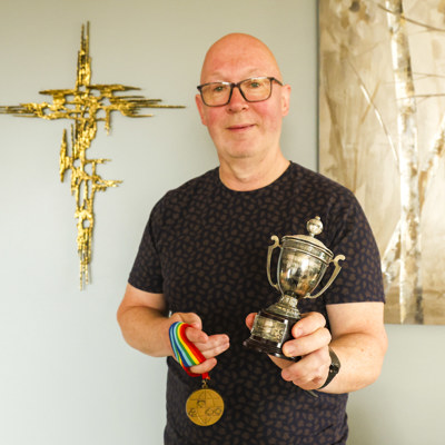 „Við fengum líka medalíu og hver okkar litla, hnefastóra útgáfu af Bermúdaskálinni,“ segir Aðalsteinn og nær í sína fyrir myndatöku.