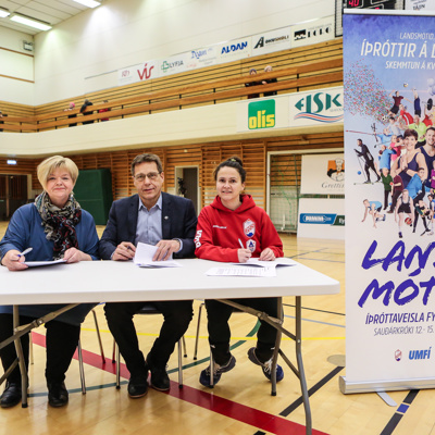 Ásta Björg Pálmadóttir, sveitarstjóri í Skagafirði, Haukur Valtýsson, formaður Ungmennafélags Íslands (UMFÍ), og Arnrún Halla Arnórsdóttir, formaður Ungmennasambands Skagafjarðar (UMSS) skrifuðu síðdegis á fimmtudag undir samning um Landsmótið, sem haldið verður á Sauðárkróki í sumar.