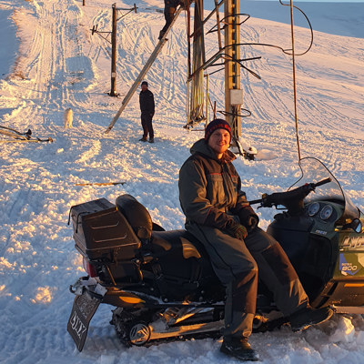 „Við erum hér vaskur hópur fólks við að koma skíðasvæðinu í gagnið,“ segir Anton Freyr Birgisson þar sem hann hangir utan á einu af átta möstrum skíðalyftunnar við Mývatn þegar rætt er við hann.