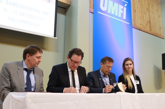Kristján Þór Júlíusson, mennta- og menningarmálaráðherra, og Haukur Valtýsson, formaður UMFÍ, skrifuðu undir samning um ríkisframlag til UMFÍ til næstu þriggja ára í dag. Þetta er tímamótasamningur enda í fyrsta sinn sem stjórnvöld semja við félagasamtök í meira en eitt ár í senn.